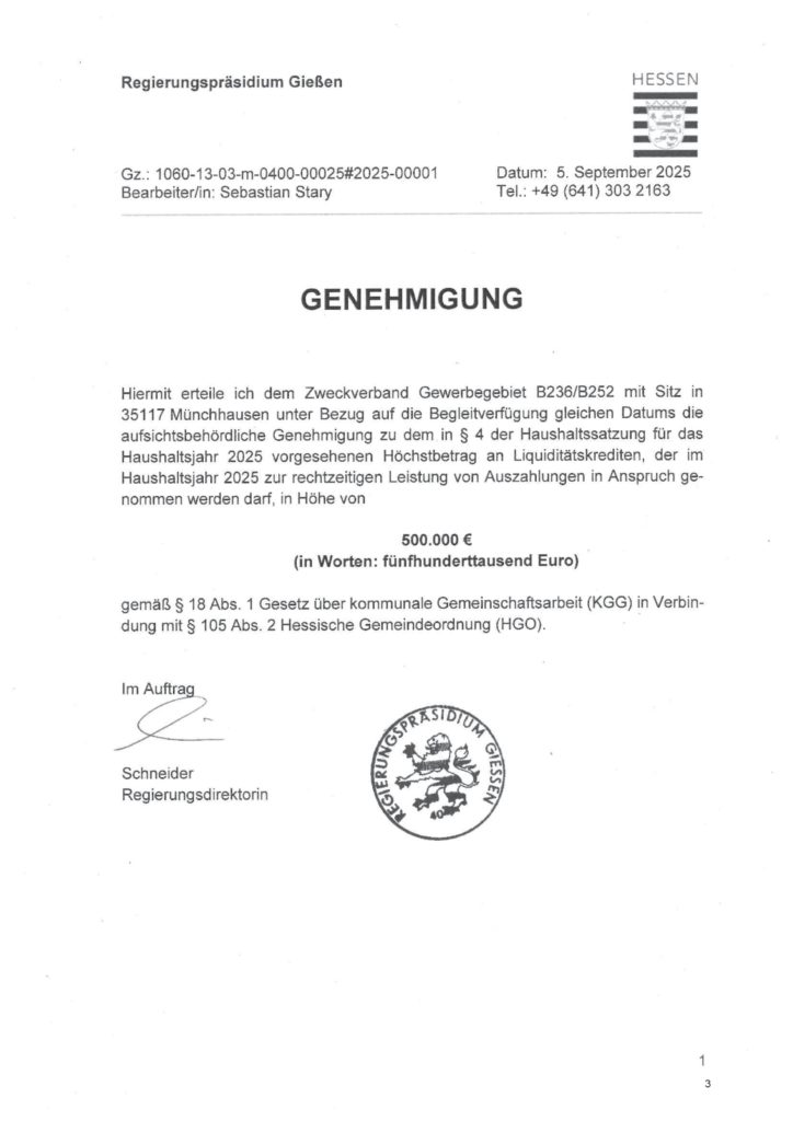 Mit Verfügung vom 23.05.2024 (Az.: RPGI-31-61a0100/10-2015/6, Dokument Nr.: 2024/687382) hat das Regierungspräsidium Gießen die Genehmigung der Flächennutzungsplanänderung mitgeteilt.
